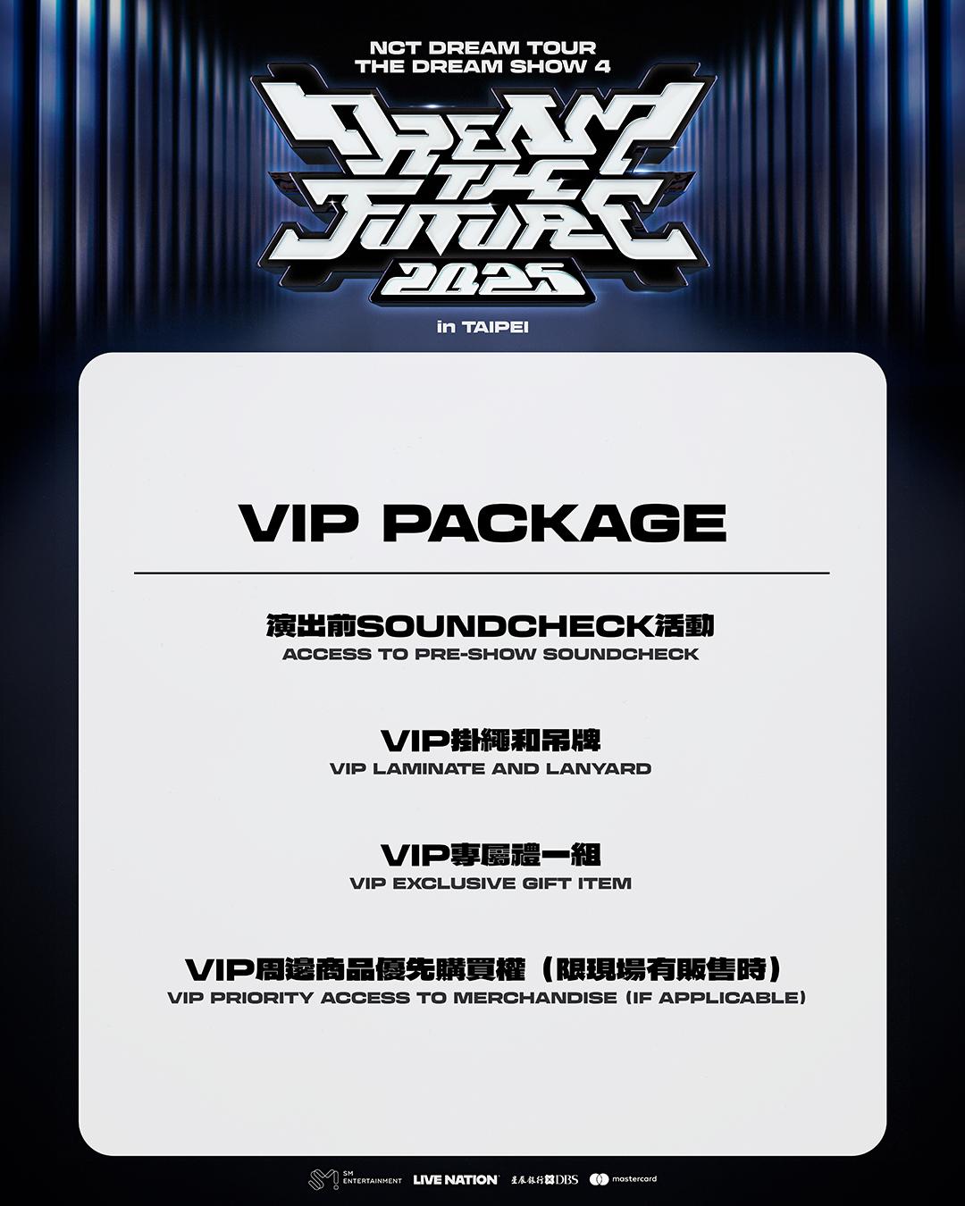 演出前SOUNDCHECK活動、VIP掛繩和吊牌x1組、VIP專屬禮x1組、周邊商品優先購買權(限現場有販售時)